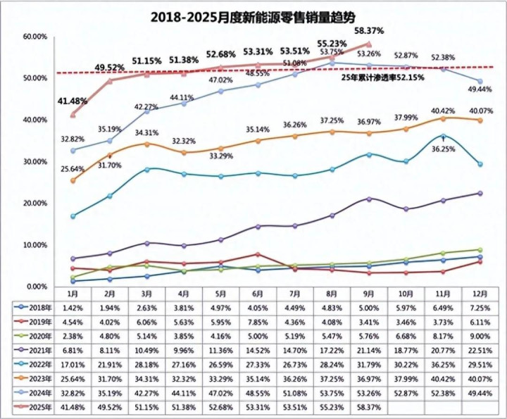 事实上,从市占率来看,我国早已具备实施“油电同权”的条件——据网上数据统计,今年以来,国内单月的新能源车渗透率早已多次突破50%,9月份的渗透率更是高达58.37%!